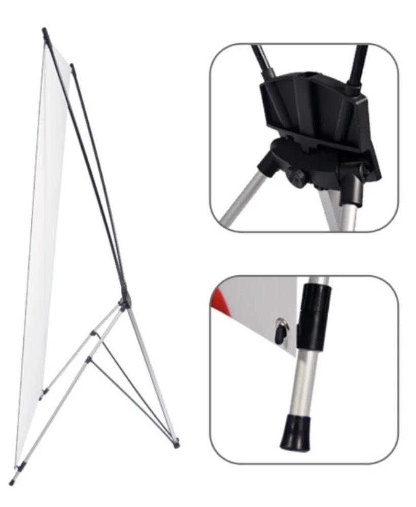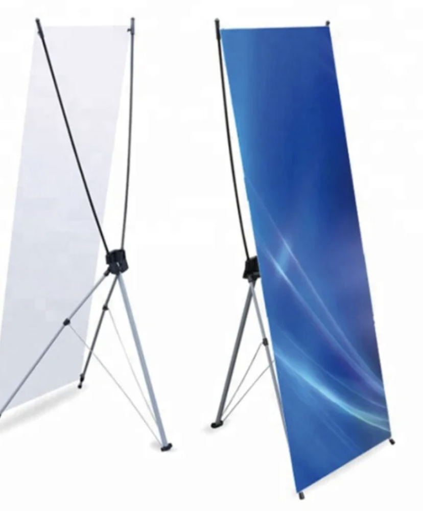 استاند على شكل حرف x .مقاس 180cmx80cm .يشمل الاستاند والطباعه .خامة الطباعه بوستر 300 جرام .لا يشمل التصميم .يوجد اسعار خاصه للكميات اقل كميه 10 حبات